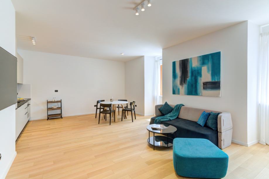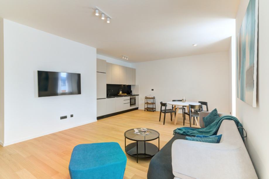 Stan se sastoji od prostrane spavaće sobe koja pruža miran i udoban prostor za odmor. U predsoblju spavaće sobe nalazi se veliki ugradbeni ormar koji osigurava dovoljno prostora za pohranu stvari. Moderna i elegantna kupaonica opremljena je vrhunskim sanitarijama, dok prostrani dnevni boravak nudi idealan prostor za opuštanje i druženje, s puno prirodne svjetlosti. Otvoreni koncept blagovaonice i kuhinje pruža savršen prostor za kuhanje i uživanje u obrocima s obitelji i prijateljima.