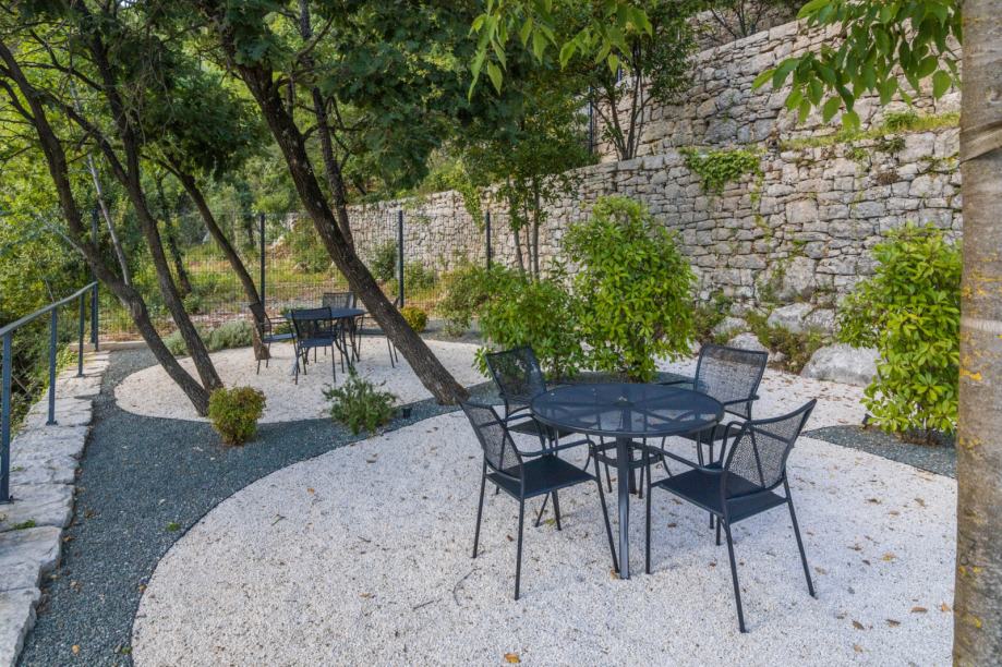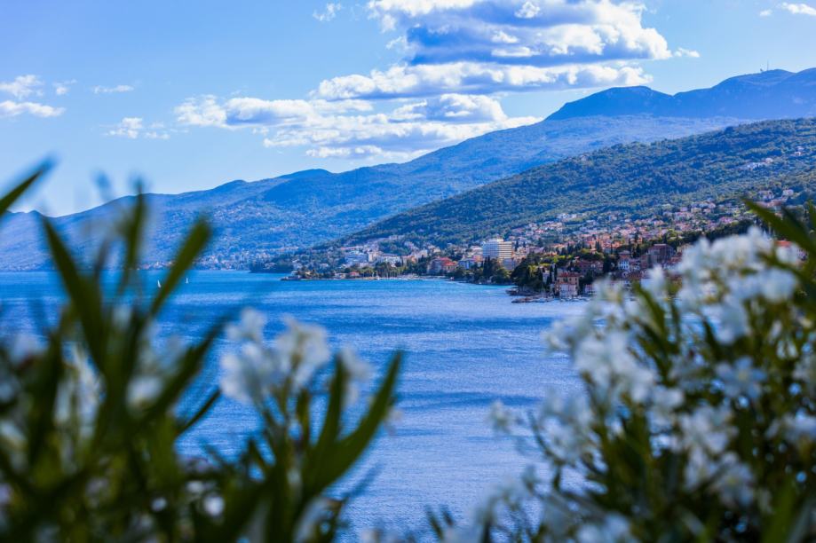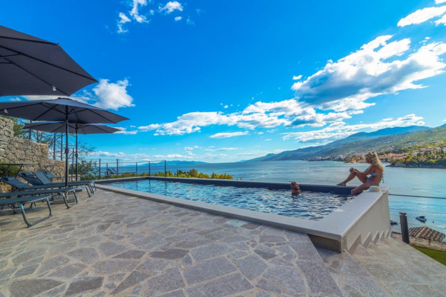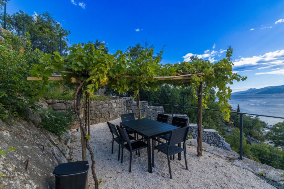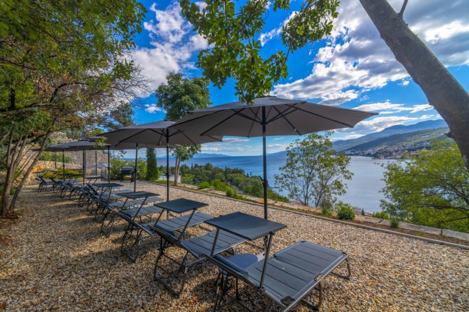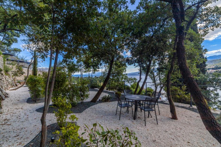 Posebna odlika ovog stana je predivna vrtna terasa površine 44 m², uređena autohtonim mediteranskim biljem. S terase se pruža impresivan pogled na cijeli Kvarnerski zaljev, što je idealno za uživanje u toplim večerima i opuštanje na svježem zraku. Veliki zajednički bazen izdignut iznad vrtnih terasa dodatno obogaćuje ovu nekretninu, pružajući mogućnost uživanja u plivanju s panoramskim pogledom na more.