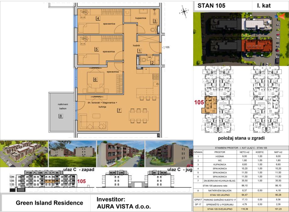 Stan oznake ST-105 nalazi se na 1. katu na ulazu C. Stambena površina stana iznosi 86,10 m2, sadrži natkriveni balkon, pripada mu jedno garažno parkirno mjesto i spremište u podrumu, te je ukupna netto korisna površina stana 101,23 m2. Tlocrt stana i pregled površina se nalaze u slikama.