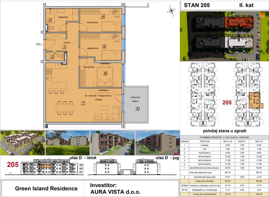 Stan oznake ST-205 nalazi se na 2.katu na ulazu D. Stambena površina stana iznosi 86,10 m2, sadrži natkriveni balkon, jedno garažno parkirno mjesto i spremište u podrumu, te je ukupna netto korisna površina stana 106,55 m2. Tlocrt stana i pregled površina se nalaze u slikama.