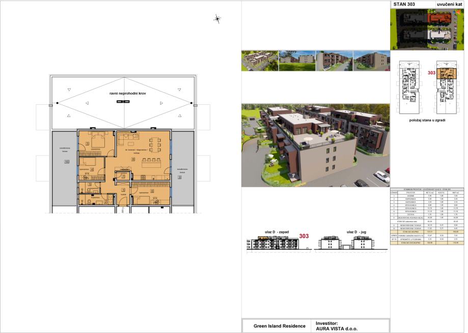 Stan oznake ST-303 nalazi se na 3. katu na ulazu D. Stambena površina stana iznosi 95,50 m2, sadrži dvije nenatkrivene terase, pripada mu jedno garažno parkirno mjesto i spremište u podrumu, te je ukupna netto korisna površina stana 116,48 m2. Tlocrt stana i pregled površina se nalaze u slikama.