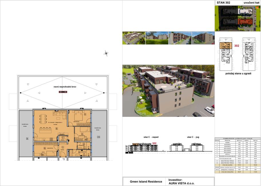 Stan oznake ST-302 nalazi se na 3. katu na ulazu C. Stambena površina stana iznosi 95,50 m2, sadrži dvije nenatkrivene terase, pripada mu jedno garažno parkirno mjesto i spremište u podrumu, te je ukupna netto korisna površina stana 116,53 m2. Tlocrt stana i pregled površina se nalaze u slikama.