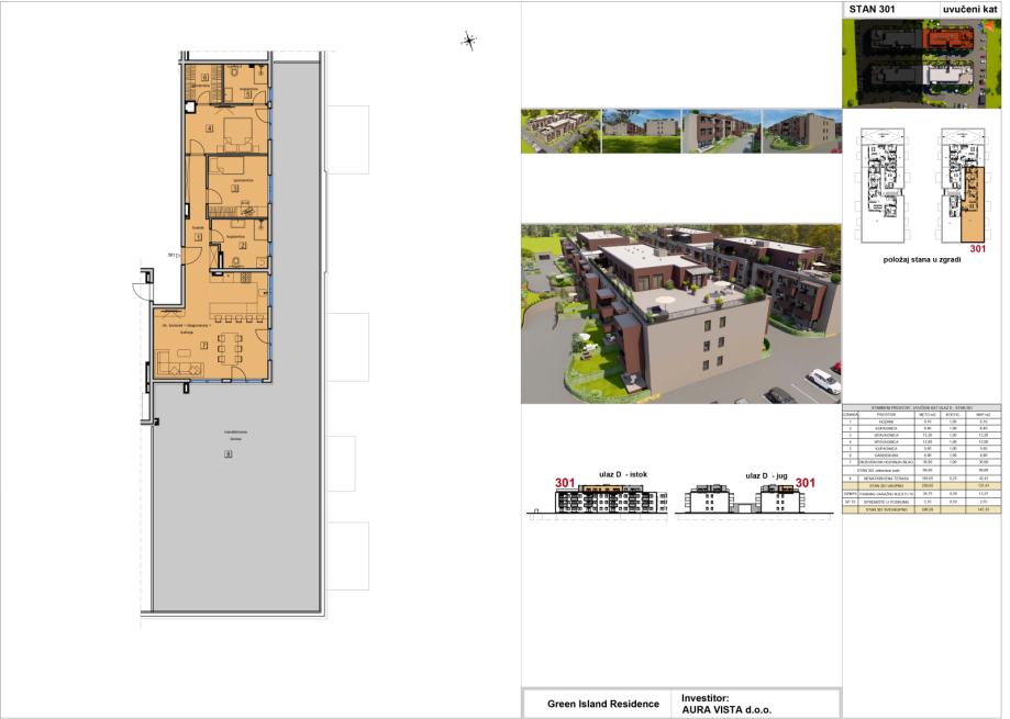 Stan oznake ST-301 nalazi se na 3. katu na ulazu D. Stambena površina stana iznosi 89,00 m2, sadrži nenatkrivenu terasu, jedno garažno parkirno mjesto i spremište u podrumu, te je ukupna netto korisna površina stana 147,33 m2. Tlocrt stana i pregled površina se nalaze u slikama.