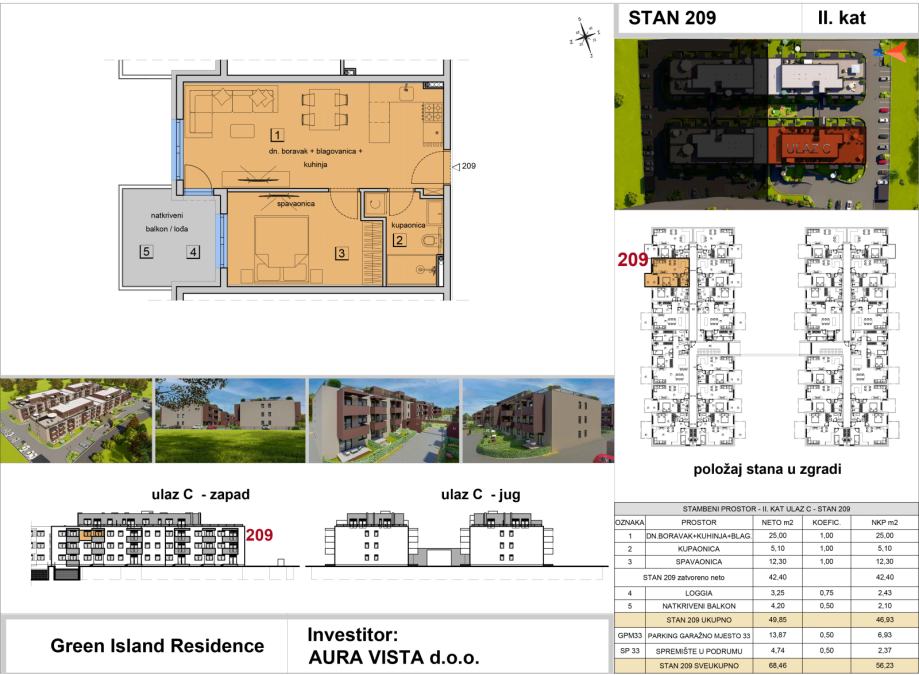 Stan oznake ST-209 nalazi se na 2. katu na ulazu C. Stambena površina stana iznosi 56,23 m2, sadrži loggiu i natkriveni balkon, pripada mu jedno garažno parkirno mjesto i spremište u podrumu, te je ukupna netto korisna površina stana 56,23 m2. Tlocrt stana i pregled površina se nalaze u slikama.