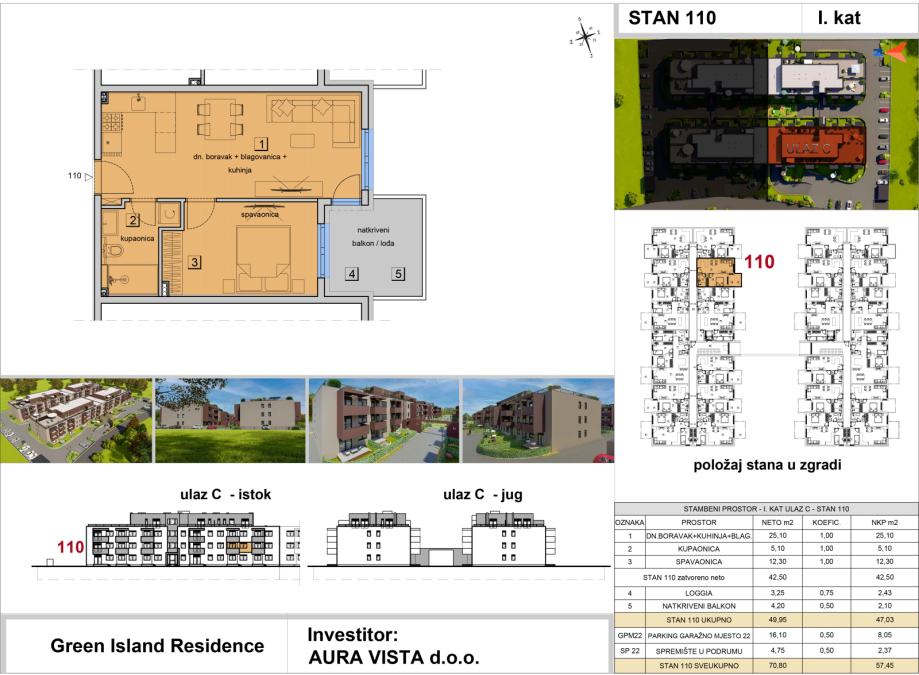Stan oznake ST-110 nalazi se na 1. katu na ulazu C. Stambena površina stana iznosi 42,50 m2, sadrži loggiu i natkriveni balkon, pripada mu jedno garažno parkirno mjesto i spremište u podrumu, te je ukupna netto korisna površina stana 57,45 m2. Tlocrt stana i pregled površina se nalaze u slikama.