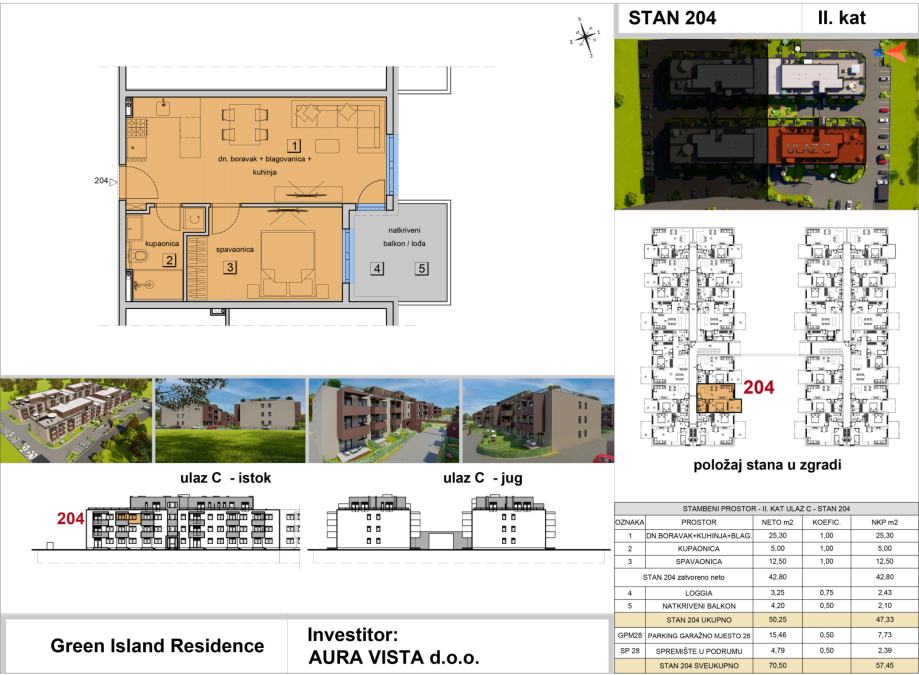 Stan oznake ST-204 nalazi se na 2. katu na ulazu C. Stambena površina stana iznosi 42,80 m2, sadrži loggiu i natkriveni balkon, pripada mu jedno garažno parkirno mjesto i spremište u podrumu, te je ukupna netto korisna površina stana 57,45 m2. Tlocrt stana i pregled površina se nalaze u slikama.