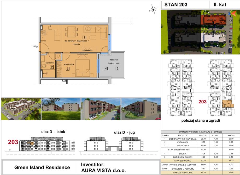 Stan oznake ST-203 nalazi se na 2.katu na ulazu D. Stambena površina stana iznosi 42,80 m2, sadrži loggiu, natkriveni balkon, jedno garažno parkirno mjesto i spremište u podrumu, te je ukupna netto korisna površina stana 57,88 m2. Tlocrt stana i pregled površina se nalaze u slikama.