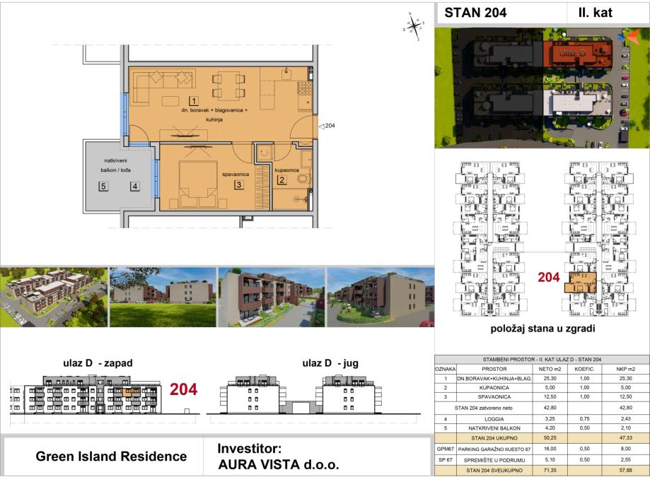 Stan oznake ST-204 nalazi se na 2.katu na ulazu D. Stambena površina stana iznosi 42,80 m2, sadrži loggiu, natkriveni balkon, jedno garažno parkirno mjesto i spremište u podrumu, te je ukupna netto korisna površina stana 57,88 m2. Tlocrt stana i pregled površina se nalaze u slikama.