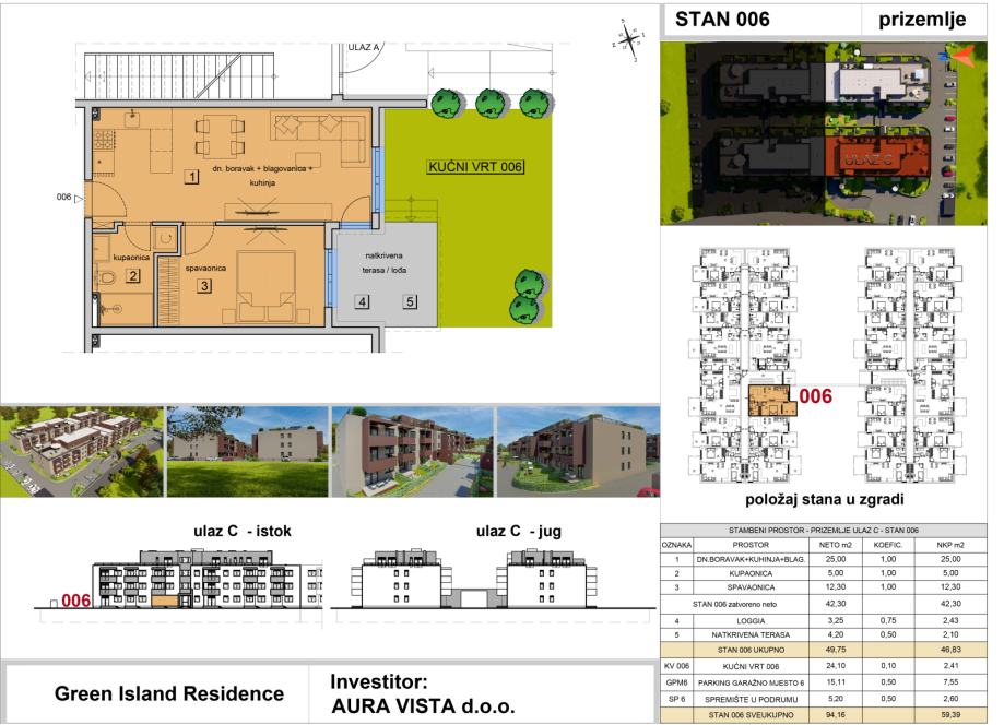 Stan oznake ST-006 nalazi se u prizemlju na ulazu C. Stambena površina stana iznosi 42,30 m2, sadrži loggiu i natkrivenu terasu, pripadaju mu vrt, jedno garažno parkirno mjesto i spremište u podrumu, te je ukupna netto korisna površina stana 59,39 m2. Tlocrt stana i pregled površina se nalaze u slikama.