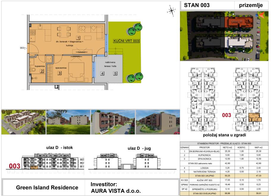 Stan oznake ST-003 nalazi se u prizemlju na ulazu D. Stambena površina stana iznosi 55,00 m2, sadrži loggiu, natkrivenu terasu pripadaju mu vrt, jedno garažno parkirno mjesto i spremište u podrumu, te je ukupna netto korisna površina stana 75,42 m2. Tlocrt stana i pregled površina se nalaze u slikama.