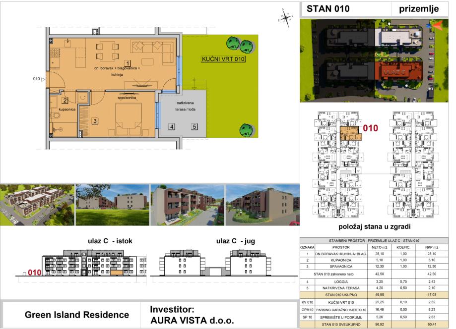 Stan oznake ST-010 nalazi se u prizemlju na ulazu C. Stambena površina stana iznosi 42,50 m2, sadrži loggiu i natkrivenu terasu, pripadaju mu vrt, jedno garažno parkirno mjesto i spremište u podrumu, te je ukupna netto korisna površina stana 60,41 m2. Tlocrt stana i pregled površina se nalaze u slikama.
