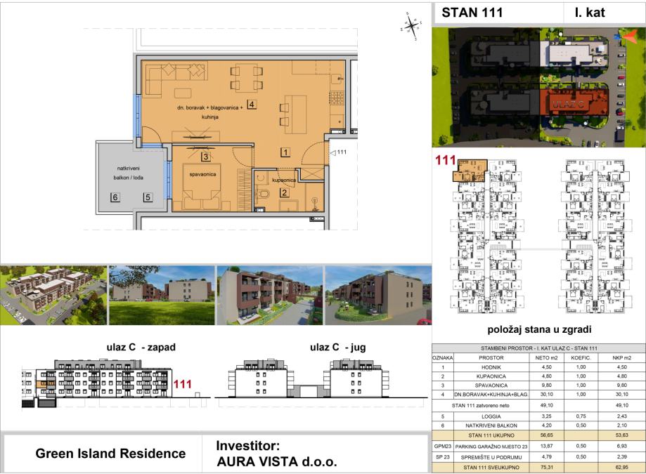 Stan oznake ST-111 nalazi se na 1. katu na ulazu C. Stambena površina stana iznosi 49,10 m2, sadrži loggiu i natkriveni balkon, pripada mu jedno garažno parkirno mjesto i spremište u podrumu, te je ukupna netto korisna površina stana 62,95 m2. Tlocrt stana i pregled površina se nalaze u slikama.