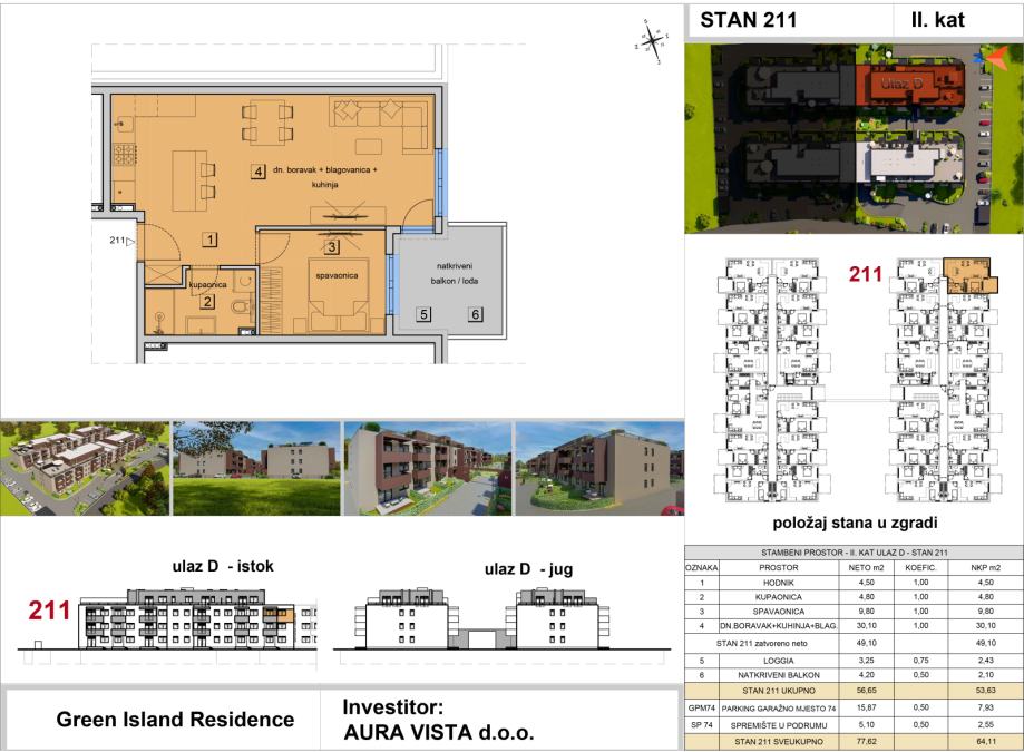 Stan oznake ST-211 nalazi se na 2.katu na ulazu D. Stambena površina stana iznosi 49,10 m2, sadrži loggiu, natkriveni balkon, jedno garažno parkirno mjesto i spremište u podrumu, te je ukupna netto korisna površina stana 64,11 m2. Tlocrt stana i pregled površina se nalaze u slikama.
