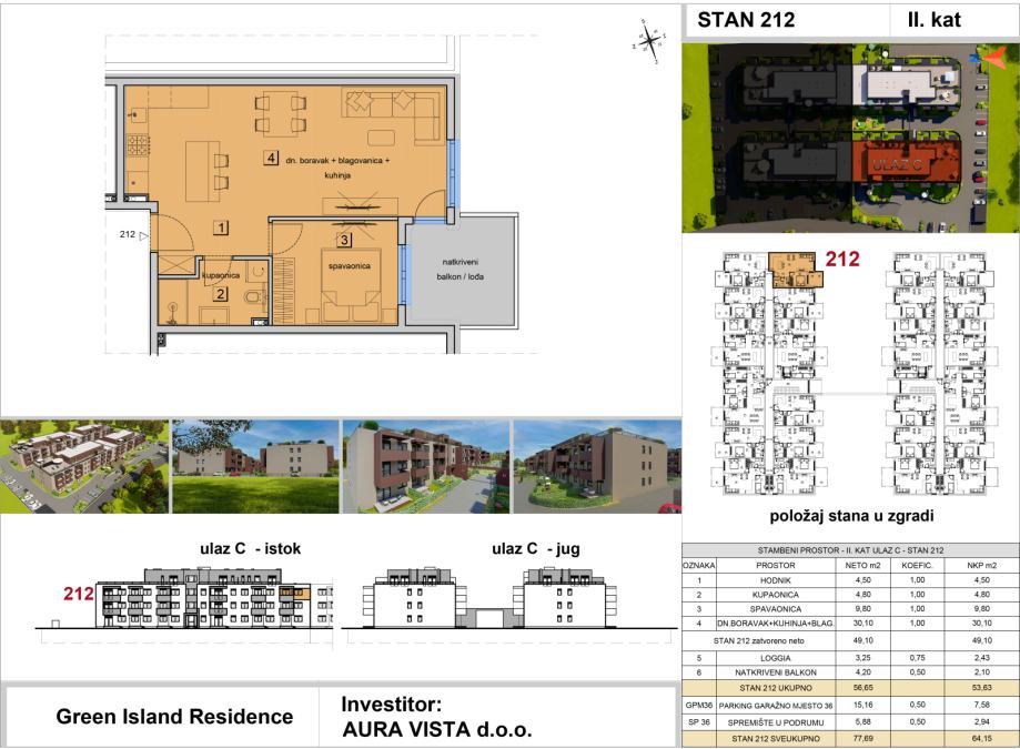 Stan oznake ST-212 nalazi se na 2. katu na ulazu C. Stambena površina stana iznosi 49,10 m2, sadrži loggiu i natkriveni balkon, pripada mu jedno garažno parkirno mjesto i spremište u podrumu, te je ukupna netto korisna površina stana 64,15 m2. Tlocrt stana i pregled površina se nalaze u slikama.
