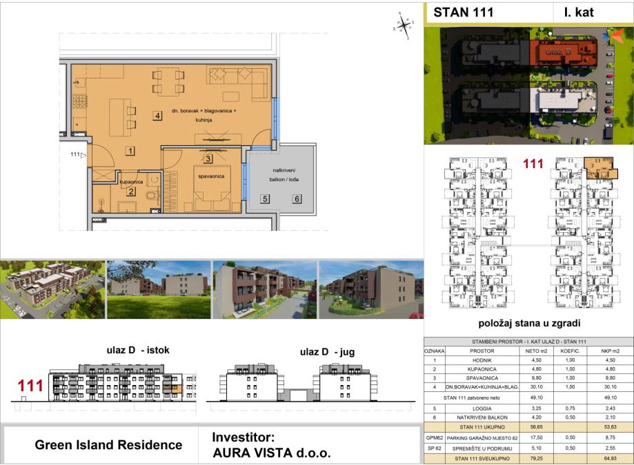 Stan oznake ST-111 nalazi se na 1.katu na ulazu D. Stambena površina stana iznosi 49,10 m2, sadrži loggiu, natkriveni balkon, jedno garažno parkirno mjesto i spremište u podrumu, te je ukupna netto korisna površina stana 64,93 m2. Tlocrt stana i pregled površina se nalaze u slikama.