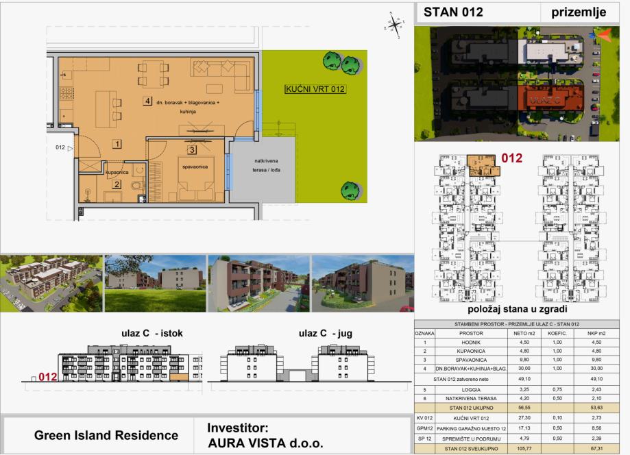 Stan oznake ST-012 nalazi se u prizemlju na ulazu C. Stambena površina stana iznosi 49,10 m2, sadrži loggiu i natkrivenu terasu, pripadaju mu vrt, jedno garažno parkirno mjesto i spremište u podrumu, te je ukupna netto korisna površina stana 67,31 m2. Tlocrt stana i pregled površina se nalaze u slikama.