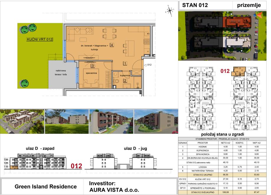 Stan oznake ST-012 nalazi se u prizemlju na ulazu D. Stambena površina stana iznosi 49,10 m2, sadrži loggiu, natkrivenu terasu, jedno garažno parkirno mjesto i spremište u podrumu, te je ukupna netto korisna površina stana 67,47m2. Tlocrt stana i pregled površina se nalaze u slikama.