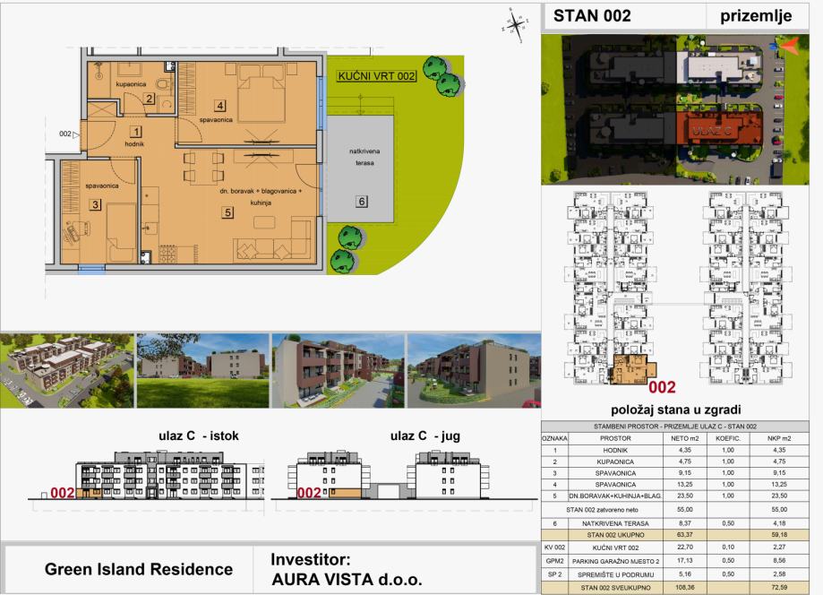 Stan oznake ST-002 nalazi se u prizemlju na ulazu C. Stambena površina stana iznosi 55,00 m2, sadrži natkrivenu terasu, pripadaju mu vrt, jedno garažno parkirno mjesto i spremište u podrumu, te je ukupna netto korisna površina stana 72,59 m2. Tlocrt stana i pregled površina se nalaze u slikama.