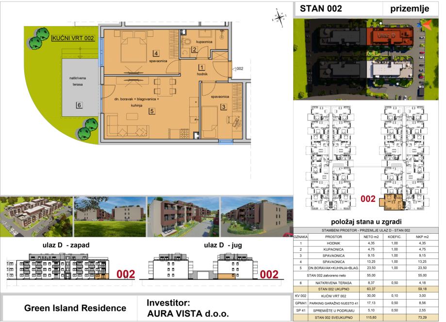 Stan oznake ST-002 nalazi se u prizemlju na ulazu D. Stambena površina stana iznosi 55,00 m2, sadrži natkrivenu terasu, pripadaju mu vrt, jedno garažno parkirno mjesto i spremište u podrumu, te je ukupna netto korisna površina stana 73,29 m2. Tlocrt stana i pregled površina se nalaze u slikama.
