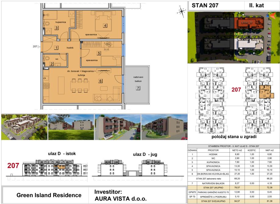 Stan oznake ST-207 nalazi se na 2.katu na ulazu D. Stambena površina stana iznosi 68,20 m2, sadrži natkriveni balkon, jedno garažno parkirno mjesto i spremište u podrumu, te je ukupna netto korisna površina stana 81,38 m2. Tlocrt stana i pregled površina se nalaze u slikama.