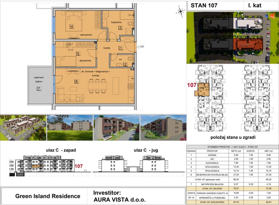 Stan oznake ST-107 nalazi se na 1. katu na ulazu C. Stambena površina stana iznosi 68,20 m2, sadrži natkriveni balkon, pripada mu jedno garažno parkirno mjesto i spremište u podrumu, te je ukupna netto korisna površina stana 82,81 m2. Tlocrt stana i pregled površina se nalaze u slikama.