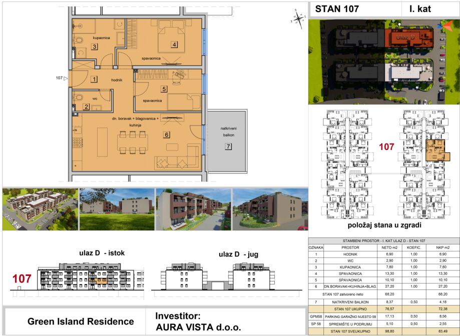 Stan oznake ST-107 nalazi se na 1.katu na ulazu D. Stambena površina stana iznosi 68,20 m2, sadrži natkriveni balkon, jedno garažno parkirno mjesto i spremište u podrumu, te je ukupna netto korisna površina stana 83,49 m2. Tlocrt stana i pregled površina se nalaze u slikama.