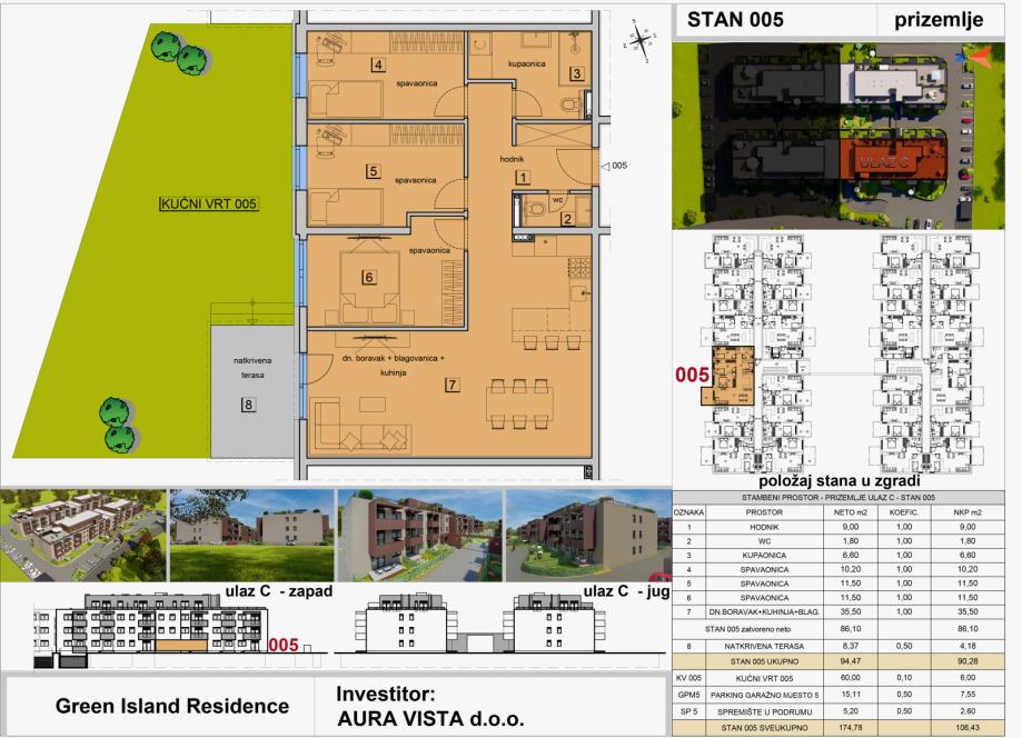 Stan oznake ST-005 nalazi se u prizemlju na ulazu C. Stambena površina stana iznosi 86,10 m2, sadrži natkrivenu terasu, pripadaju mu vrt, jedno garažno parkirno mjesto i spremište u podrumu, te je ukupna netto korisna površina stana 106,43 m2. Tlocrt stana i pregled površina se nalaze u slikama.