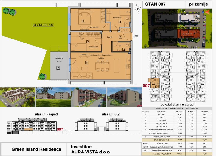 Stan oznake ST-007 nalazi se u prizemlju na ulazu C. Stambena površina stana iznosi 68,20 m2, sadrži natkrivenu terasu, pripadaju mu vrt, jedno garažno parkirno mjesto i spremište u podrumu, te je ukupna netto korisna površina stana 88,04 m2. Tlocrt stana i pregled površina se nalaze u slikama.