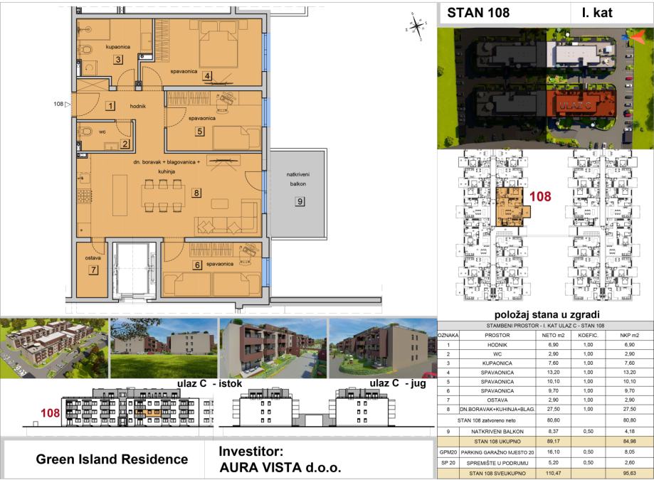 Stan oznake ST-108 nalazi se na 1. katu na ulazu C. Stambena površina stana iznosi 80,80 m2, sadrži natkriveni balkon, pripada mu jedno garažno parkirno mjesto i spremište u podrumu, te je ukupna netto korisna površina stana 95,63 m2. Tlocrt stana i pregled površina se nalaze u slikama.