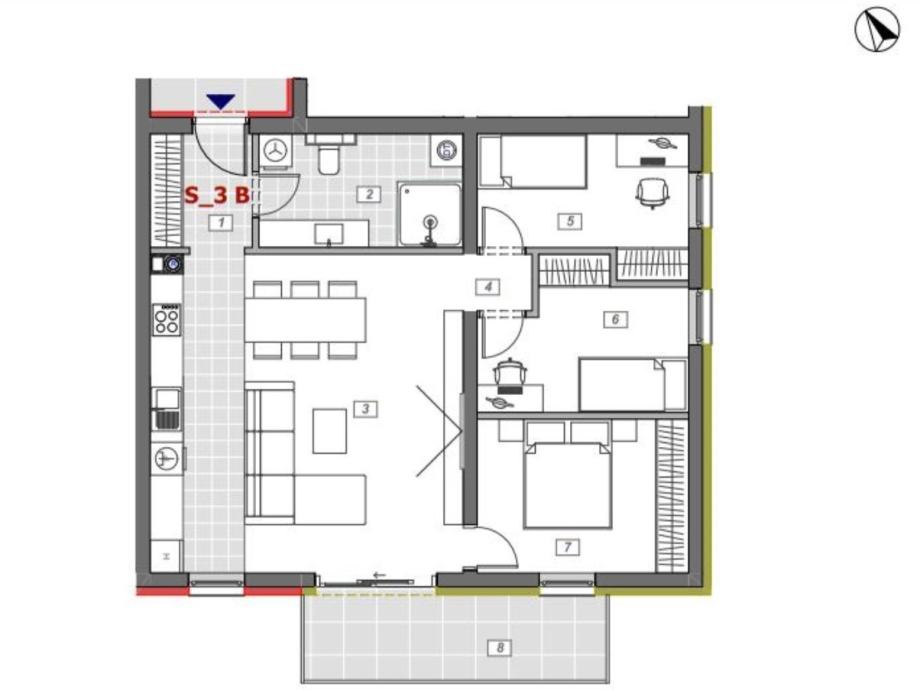 Sastoji se od hodnika, kupaonice, dnevnog boravka sa blagovanjem i kuhinjom, predprostora, 2 dječje sobe, roditeljske sobe i balkona 8,96 m².