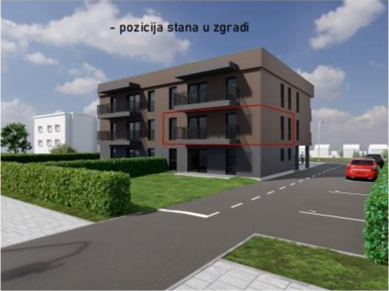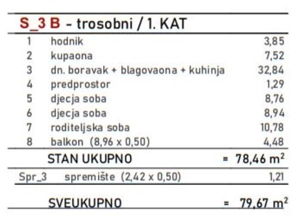 Stan se nalazi na I katu - 4 sobni stan površine 82,94 m² sa pripadajućim spremištem u prizemlju 2,42 m² i 2 pripadajuća vlastita parkirna mjesta svako površine 15,00 m².