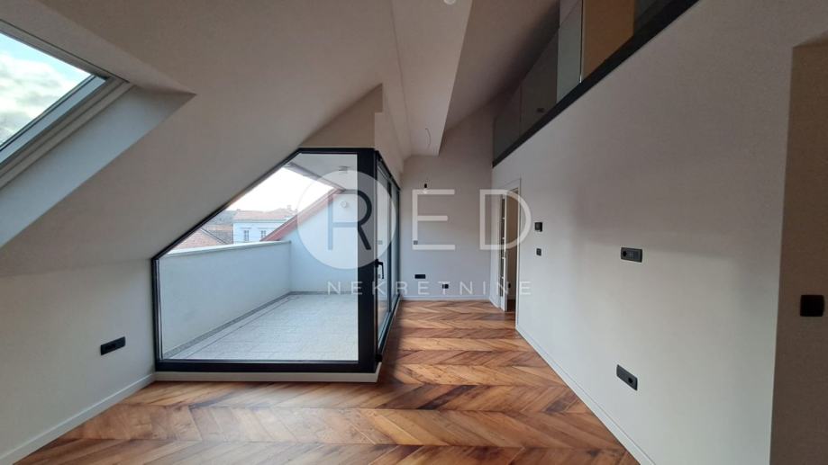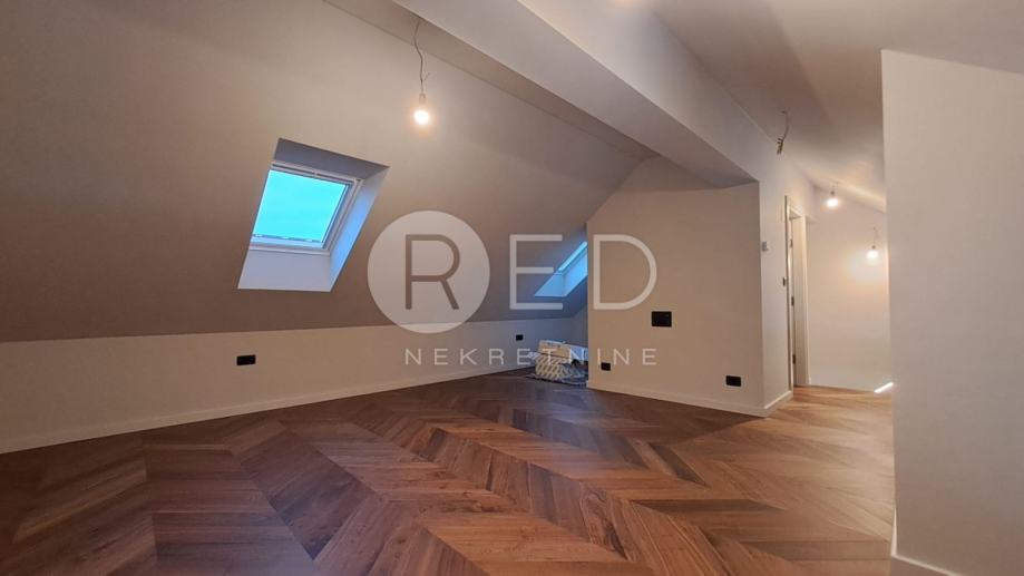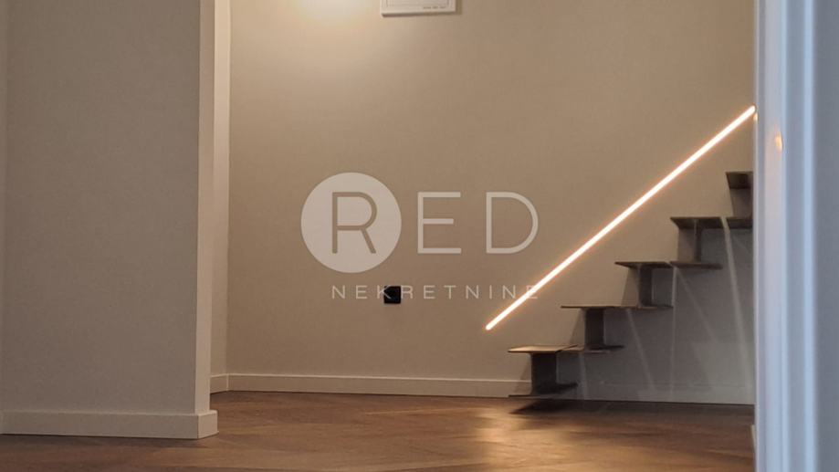 Prva etaža luksuznog stana osmišljena je kao "open space" koncept koji se sastoji od ulaznog hodnika koji nas vodi u dnevni boravak koji ima izlaz na terasu s pogledom na centar grada. U nastavku se ulazi u prostor za kuhinju te iz njega u blagovaonicu koja ima izlaz na još jednu terasu s pogledom na ostatak grada. Kupaonica s WC-om nalazi se na prvoj etaži. Posebnost ovog stana su moderne stepenice koje nas vode na prostranu galeriju od 38 m2, koja pruža iznimnu fleksibilnost za kreiranje spavaće sobe, radnog prostora ili zone za odmor, a tu se također nalazi još jedna manja kupaonica.