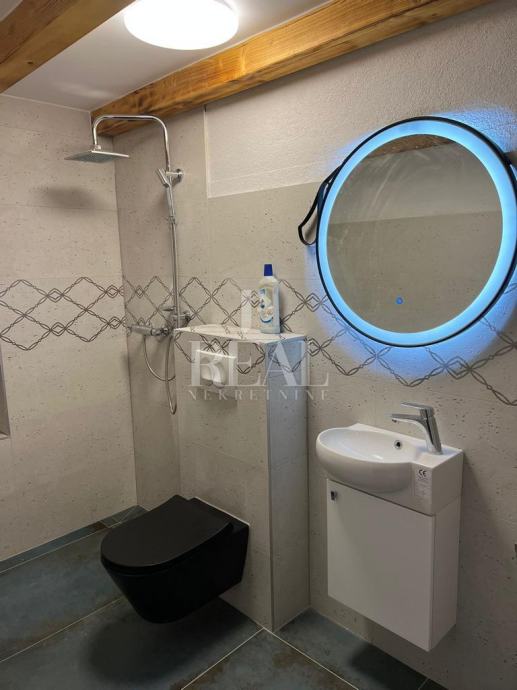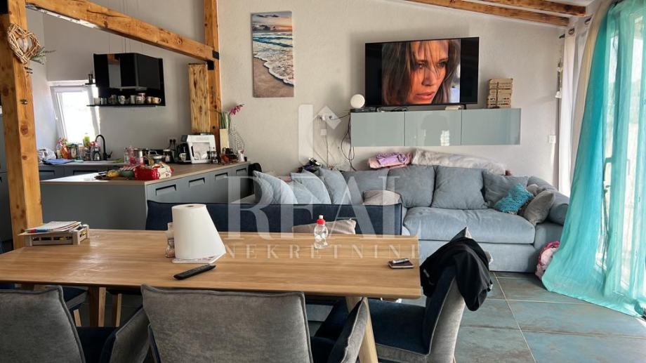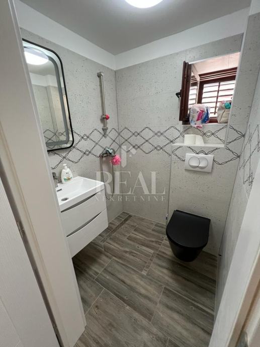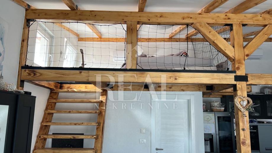 Ekskluzivan stan površine 135m2, smješten je u kući na prvom katu te zauzima prostor prvog i drugog kata, povezano unutarnjim stubištem te ima zaseban ulaz. Stan se sastoji od hodnika koji nas na prvom katu vodi do dvije spavaće sobe i kupaone. Stubištem se penjemo na drugi kat koji se sastoji od dvije velike spavaće sobe, kupaone sa podnim grijanjem, prostranog dnevnog boravka koji ima izlaz na balkon te pogled na more, kuhinje sa blagovaonom i galerije koja se koristi kao spavaća soba i još jedne kupaone. Sve kupaone imaju podno grijanje te je svaka prostorija klimatizirana, mogućnost kontrole klima putem wifi-ja.