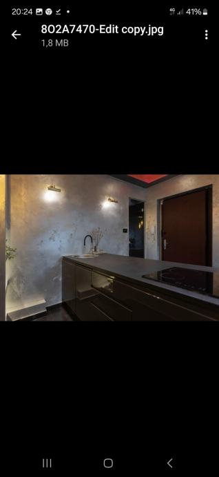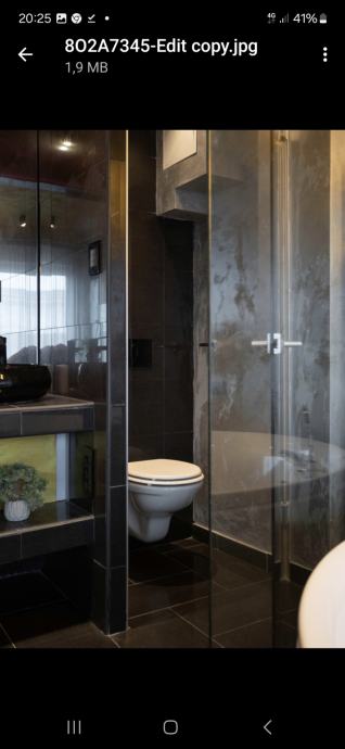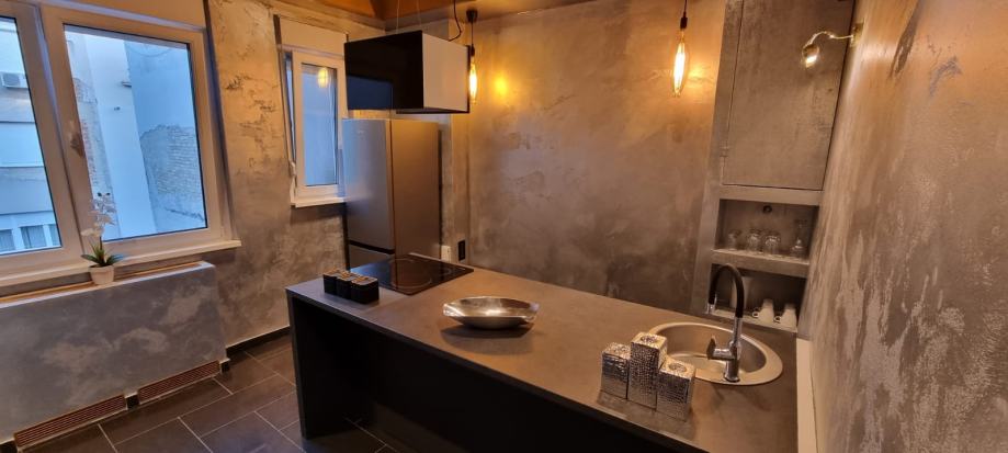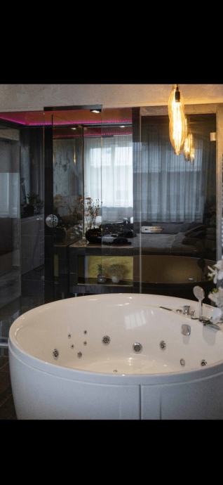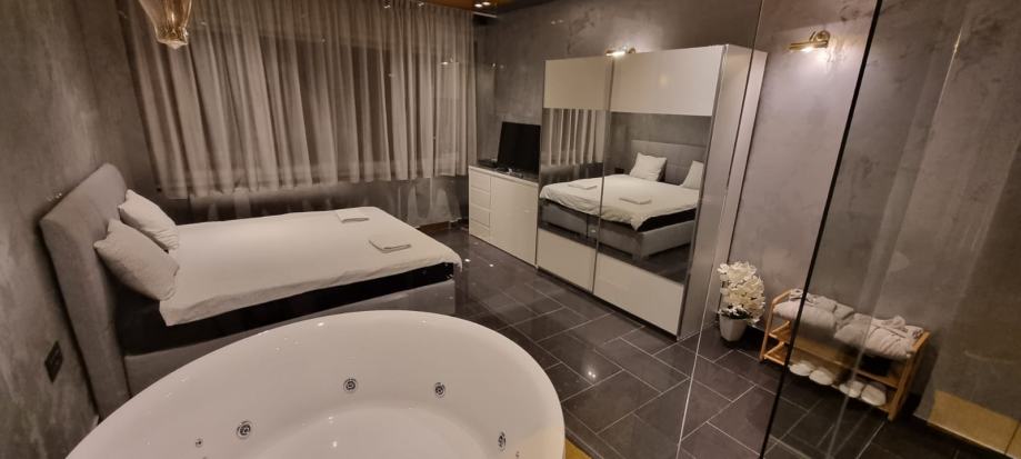Moderan stan sa velikom hidromasaznom kadom u spavacoj sobi. U spavaćoj sobi nalazi se velik (hotelski) krevet sa pogledom na lcd ekran. Soba je odijeljena od kupaone prozirnom staklenom stijenom. Kupaona je uređena modernom armaturom(crne boje) sa odvojenim toaletom. U drugoj prostoriji nalazi se moderna kuhinja (sank konstrukcija). Sva vrata u stanu su moderna velika staklena zatamnjena crne boje. Moderna rasvjeta i ugrađen surround sustav. STROGI CENTAR KOD ZLATNE KUGLE (SUNCA) U BOGOVICEVOJ.