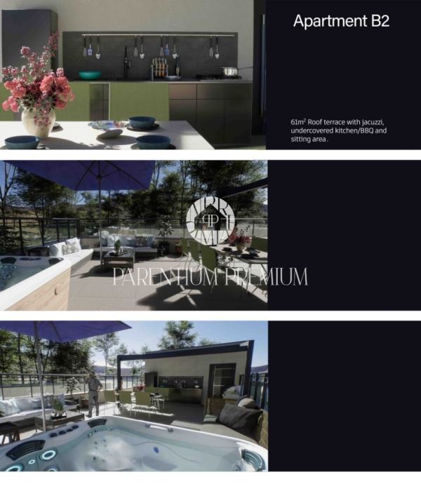 Posebna prednost ove nekretnine je prostrana krovna terasa površine 60,58 m² s pogledom na more, idealna za uređenje ljetne kuhinje, sunčališta, lounge zone ili jacuzzija.