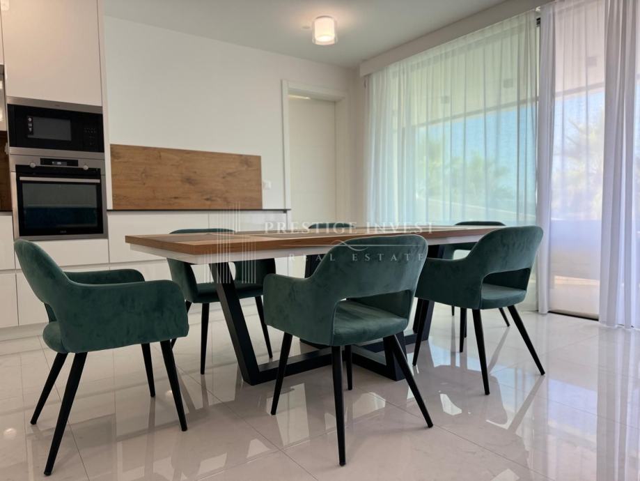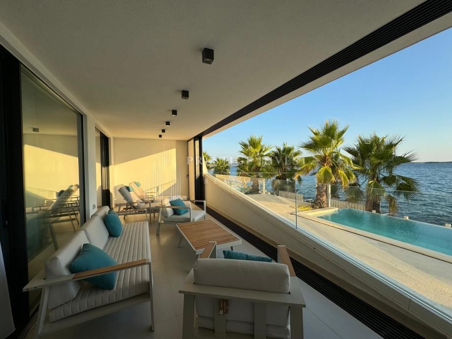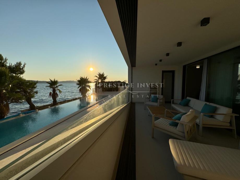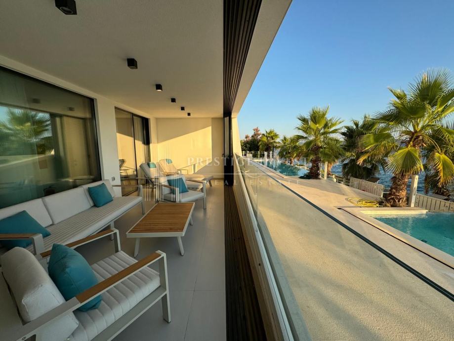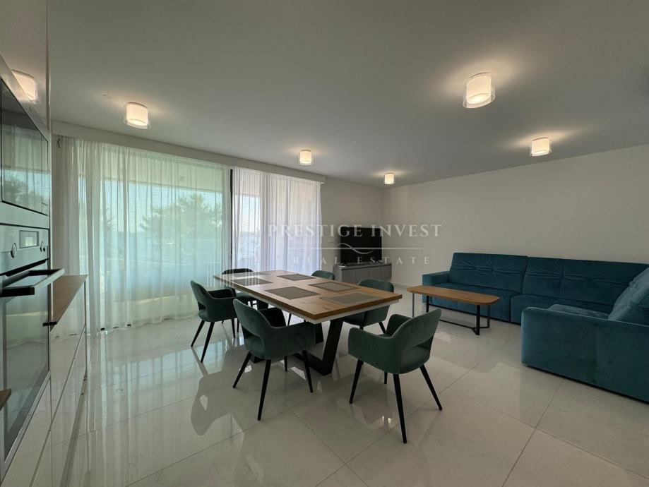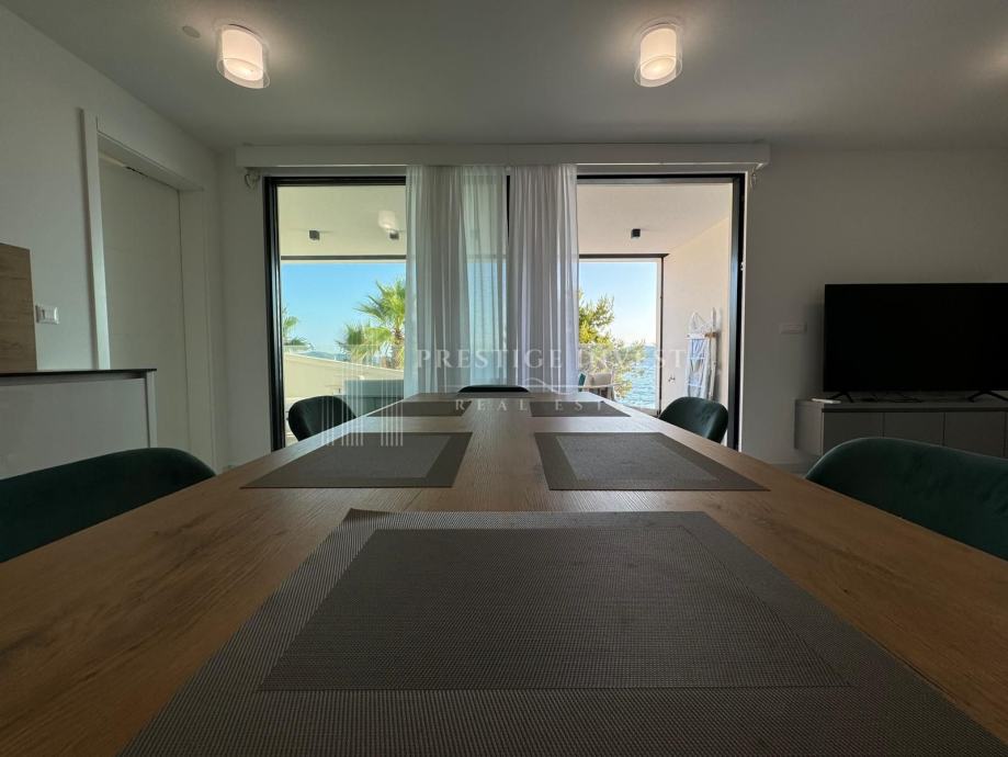 Na prodaju je luksuzan trosoban stan smješten u prizemlju moderne zgrade opremljena s liftom, bazenima i podzemnom garažom prvi red uz more.