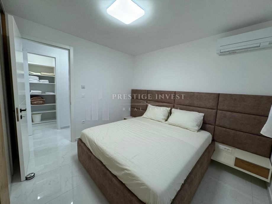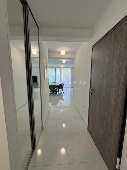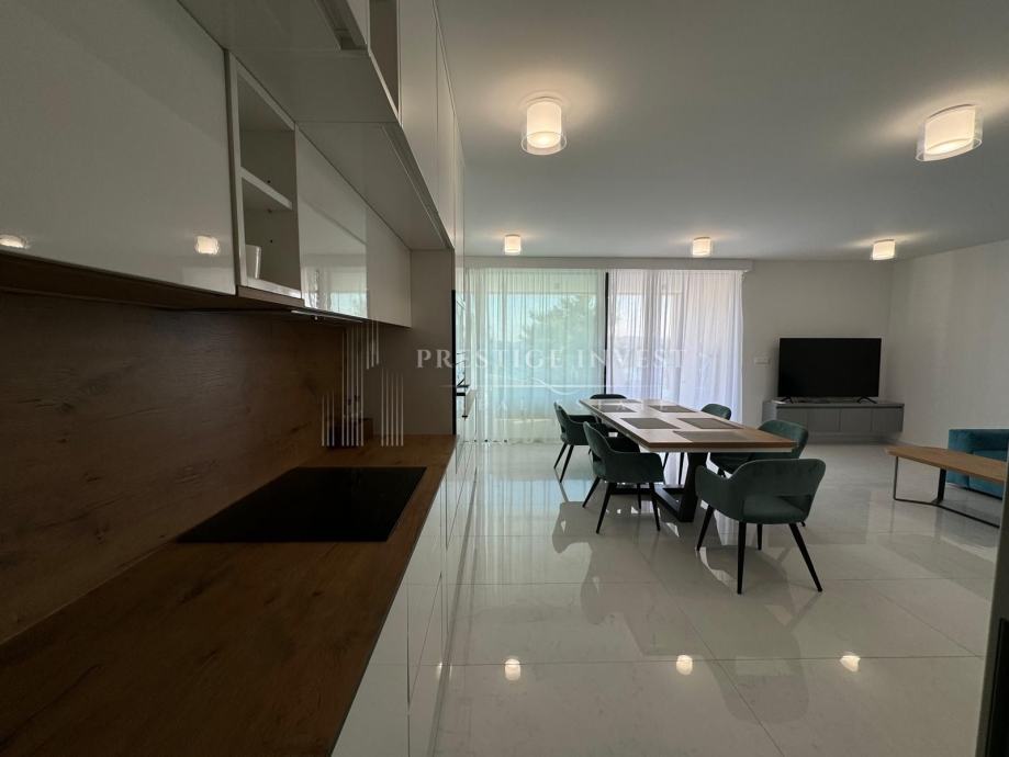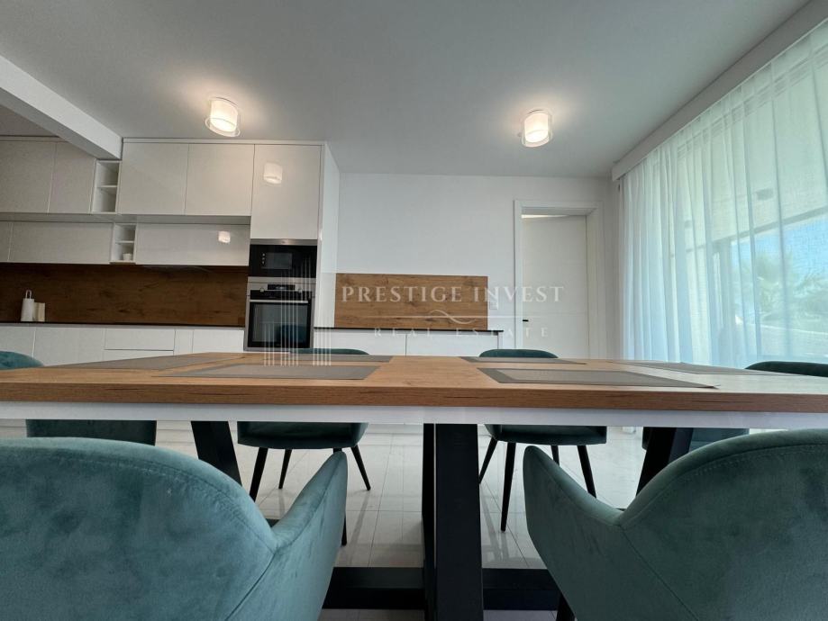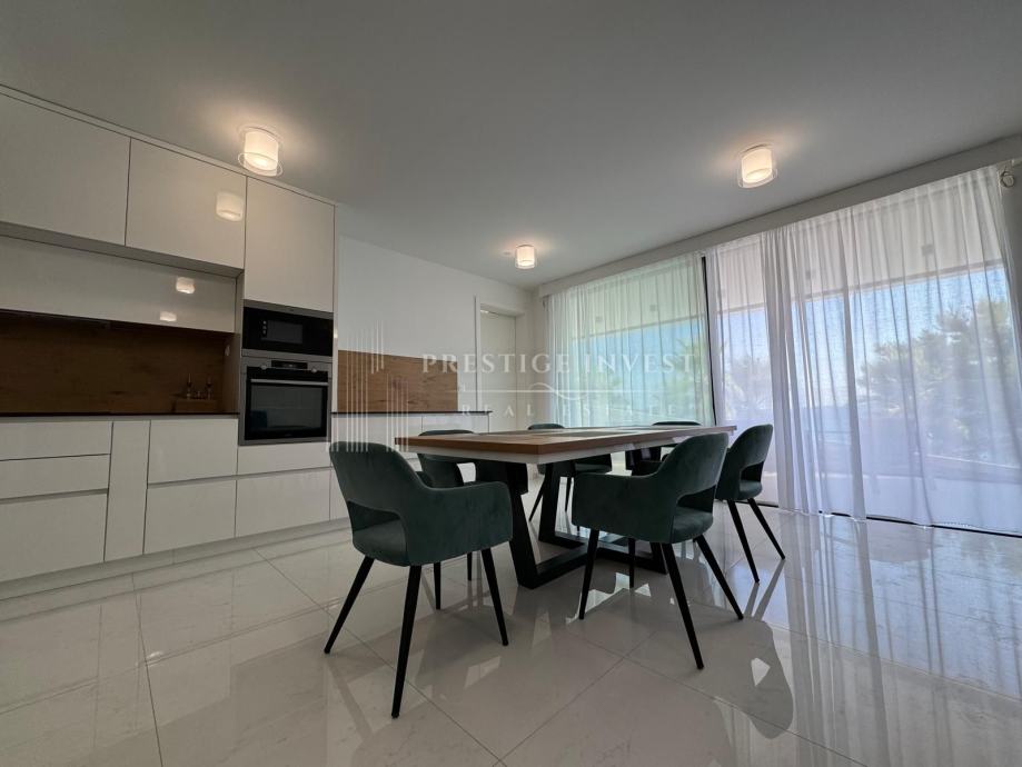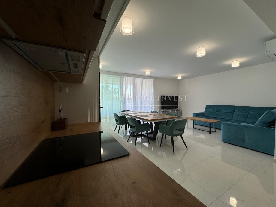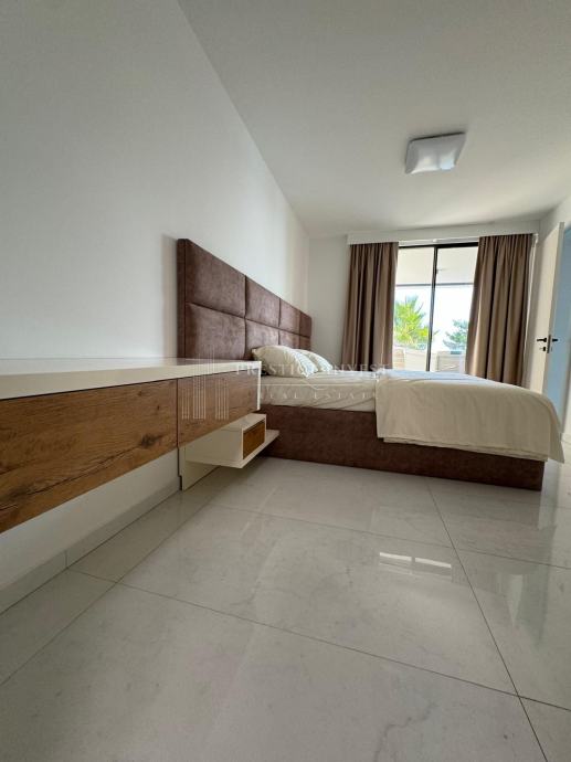 Na prodaju je luksuzan trosoban stan smješten u prizemlju moderne zgrade opremljena s liftom, bazenima i podzemnom garažom prvi red uz more.