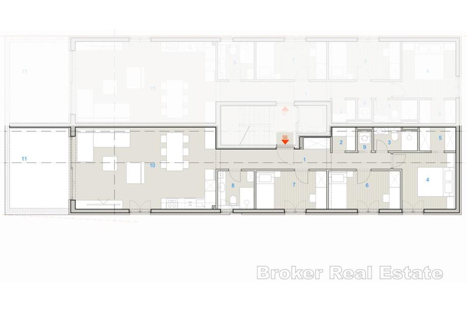 Zgrada se odlikuje elegantnom arhitekturom i pažljivo biranim materijalima, a svaki detalj osmišljen je s ciljem osiguravanja maksimalne udobnosti. Visoka razina privatnosti, neposredna blizina mora, grada Solina, Splita, te suvremeni standardi gradnje čine ovaj stan izuzetnom prilikom na tržištu.