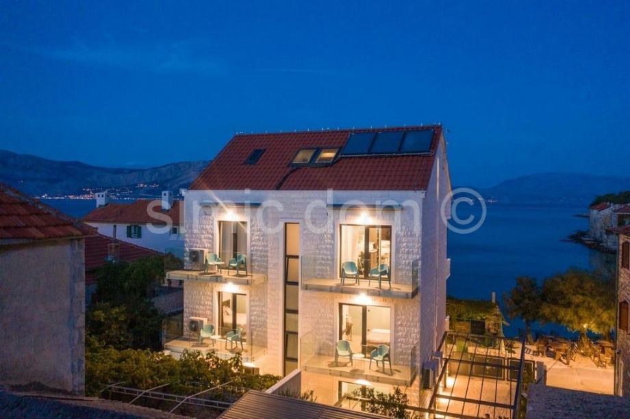 Posredujemo u prodaji ekskluzivne nekretnine na top lokaciji na otoku Braču. Riječ je o apartmanskoj vili koja se proteže na četiri etaže s ukupno 5 apartmana, dodatne spavaće sobe te spremišta. Izgrađena je na parceli od 252 m2 te njena bruto površina iznosi oko 400 m2. Pored glavnog objekta postoji i pomoćni objekt od 39 m2. Apartmani su u potpunosti opremljeni, uređeni, klimatizirani te je ugrađeno podno grijanje na solarni pogon na posljednje dvije etaže. U prizemlju se nalaze studio apartman, jednosoban apartman te odvojena soba, dok se na prvom katu nalaze dva jednosobna apartmana. Na drugom se katu nalazi jednosoban apartman te dvoetažni stan koji se proteže i potkrovljem, točnije posljednjom etažom na kojoj se nalazi i terasa s otvorenim pogledom na more. Prilikom uređenja vodilo se računa o detaljima s tim da se ni u jednom trenutku nije prešla granica dobrog ukusa i uz iznimno poštivanje i praktične strane korištenja samih jedinica. Nekretnina se nalazi u drugom redu do mora i gotovo sve njene jedinice uživaju u lijepom pogledu na more. U dvorištu su osigurana dva parkirna mjesta. Svi potrebni sadržaji nalaze se u samoj blizini. Vlasništvo uredno.