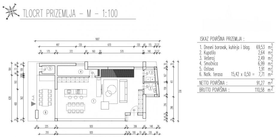 Prizemlje vile sastojati će se od prostranog dnevnog boravka, kuhinje, blagovaonice, praonice, gostinjskog wc-a, i ostava.