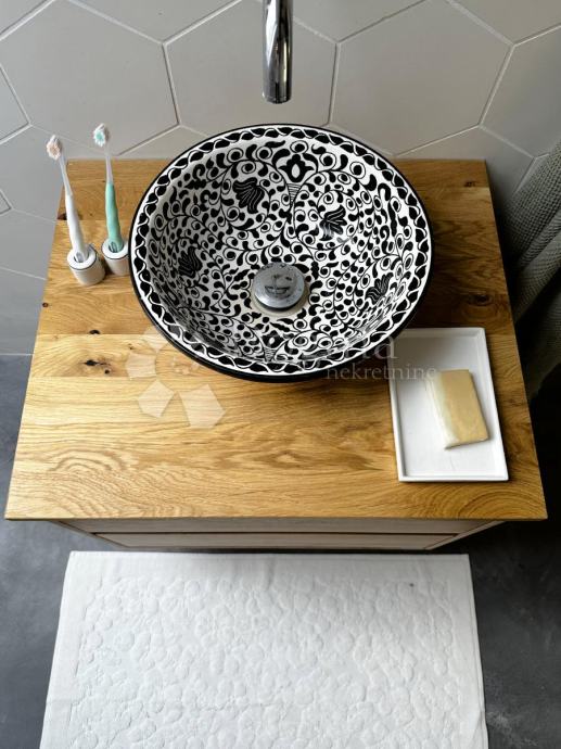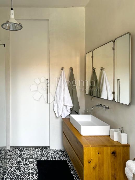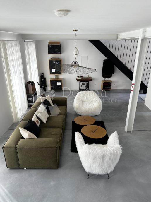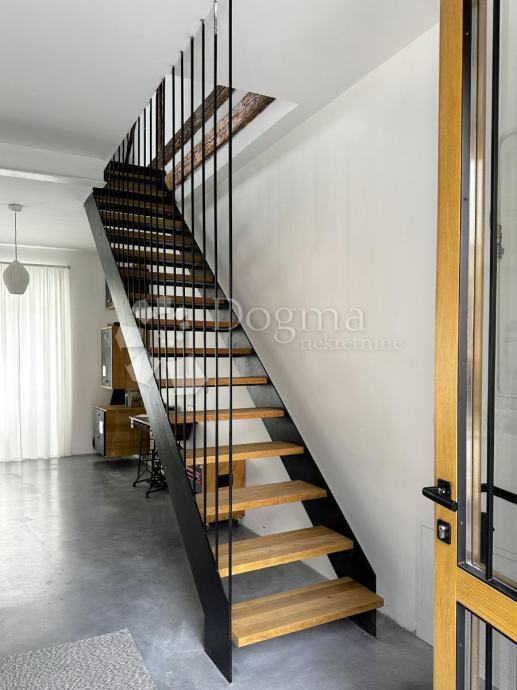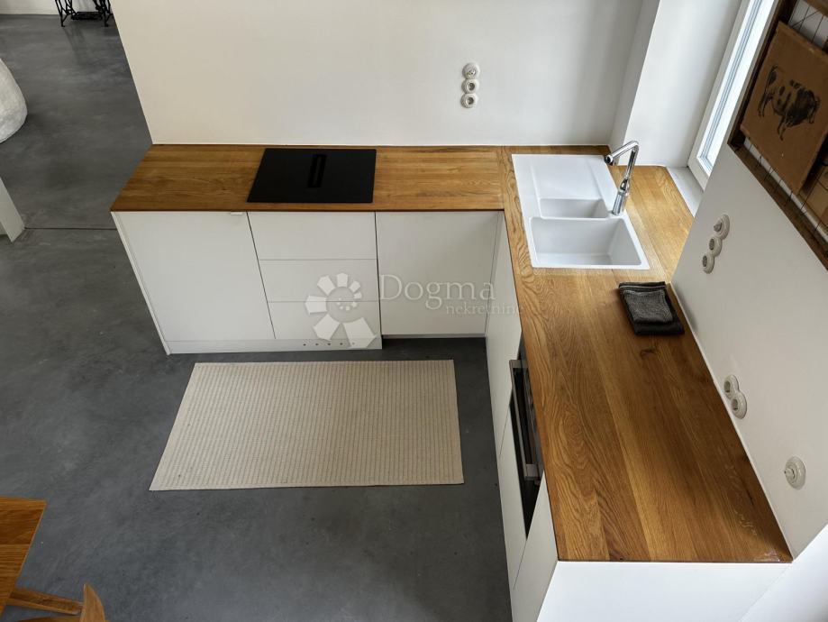 Na prvom katu nalazi se stambeni dio veličine 80 m² koji se sastoji od moderne kupaonice te kuhinje, dnevnog boravka i blagovaonice u open-space stilu s izlazom na terasu veličine 35 m². Instalacije za vodu, struju i odvode su potpuno nove, dok je cijeli kat opremljen podnim grijanjem. Završna obloga podova izrađena je od modernog microcementa, dok je terasa obložena betonom s posebnom hidroizolacijom. Stolarija je nova, izrađena od hrasta po mjeri, a kupaonica je opremljena Grohe sanitarnim elementima, Neoro umivaonikom i unikatnim cementnim pločicama uvezenim iz Maroka.