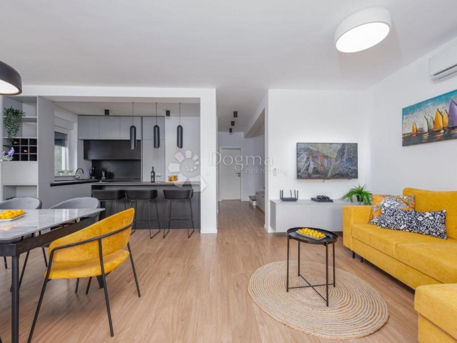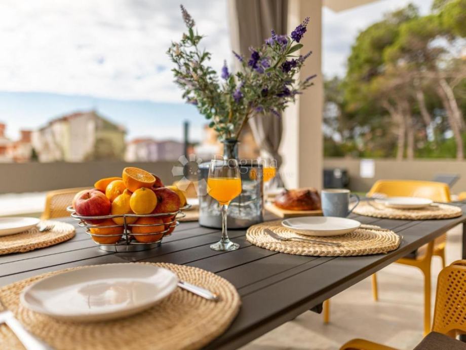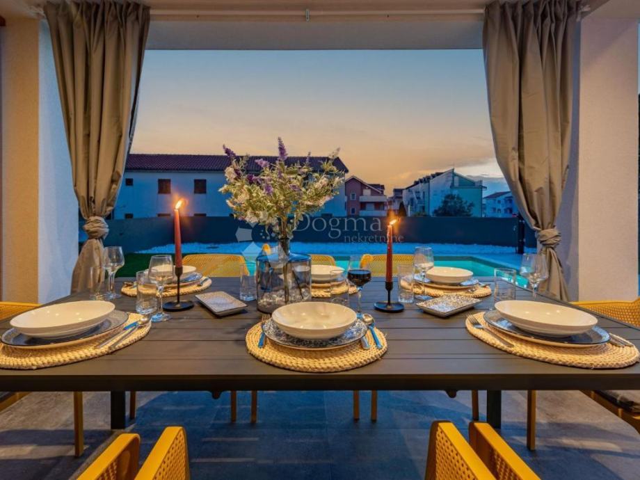 U prizemlju se nalazi prostran open-space dnevni boravak s kuhinjom i blagovaonicom, gostinjski toalet te praonica rublja. Iz dnevnog boravka pruža se direktan izlaz na terasu i bazen veličine 8x4 m, opremljen automatskim sustavom održavanja i toplinskom pumpom za grijanje i hlađenje vode.