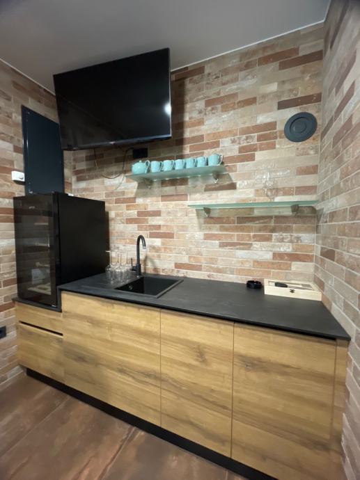 Prizemlje se sastoji od open space prostora kuhinja sa blagovaonom, dnevni boravak sa izalazom na terasu, kupaonica (tuš + parna sauna), jedna prostorija sa ormarom i prostorom za odlaganje te izlaz na dvorište.