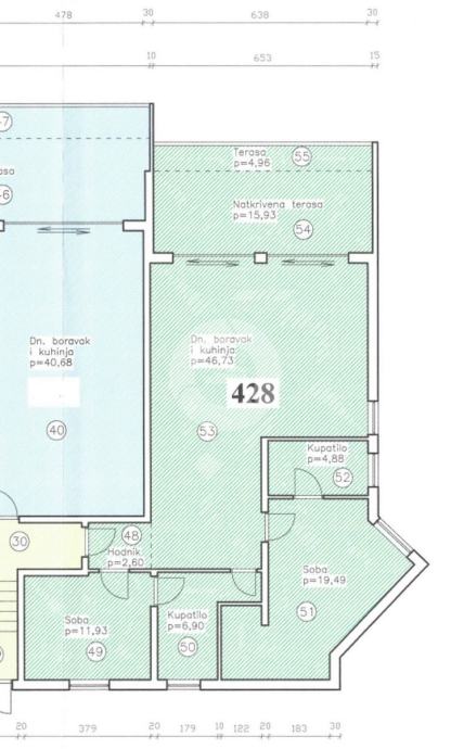 sljedećih prostorija u prizemlju zgrade: hodnika površine 2,60 m2, dnevnog boravka -kuhinje površine 46,73 m2, natrkivene terase površine 15,93 m2 i nenatkrivene 4,96 m2, kupatila površine 6,90 m2, sobe površine 19,49 m2, kupatila površine 4,88 m2, sobe površine 11,93 m2, ukupne površine 120,65 m2. Moguće je otkupiti parkirno mjesto za dodatnih 14.000 eur ili garažno mjesto za dodatnih 20.000 eur. Stan se prodaje kompletno namješten kao na fotografijama. Grijanje/hlađenje je regulirano putem klima uređaja. Vlasnicima stanova se nudi mogućnosti korištenja bazena, fitnesa, te uz određene popuste unutarnjeg bazena, golfa i slično. Obzirom na samu lokaciju i sadržaj, idealan je izbor kao investicija za turistički najam ali i za cijelogodišnji/povremeni boravak u istarskom Raju.