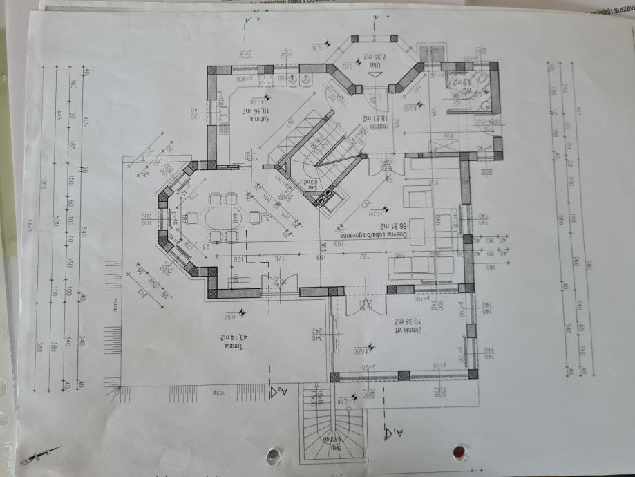 Prizemlje: garaža, ulazni prostor, kuhinja, dnevna soba s blagovaonicom, WC, zimski vrt,