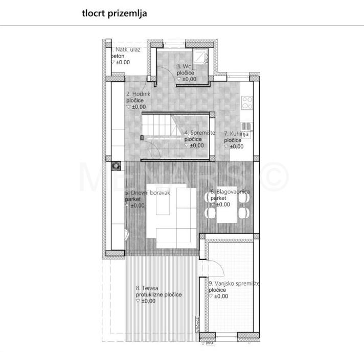 PRIZEMLJE: natkriveni ulaz, hodnik, wc, spremište ispod stubišta, dnevni boravak, blagovaonica, kuhinja, terasa - natkrivena, vanjsko spremište (tlocrt među slikama).
