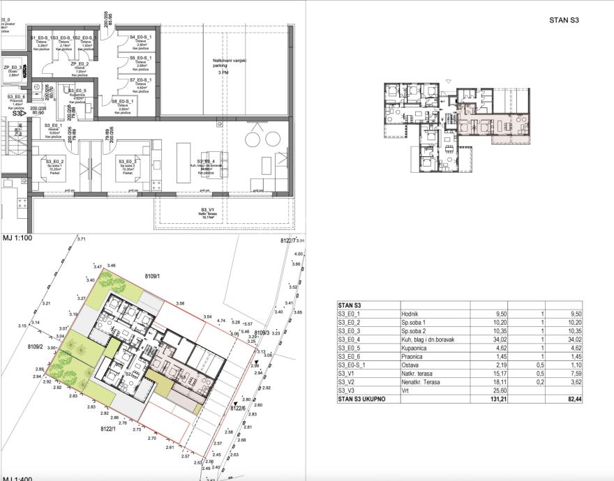 S3- 82,44 m2 sastoji se kuhinje, blagovaonice, dnevnog boravka, kupaonice, dvije spavaće sobe, ostave, praonice, natkrivene terase, nenatkrivene terase i vrta. Stanu pripada vanjsko parkirno mjesto (nije uračunato u površinu stana). CIJENA 290.000,00