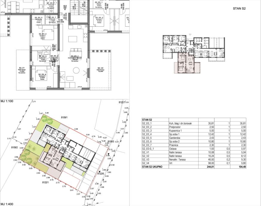S2 - 104,49 m2 sastoji se od kuhinje, blagovaonice, dnevnog boravka, kupaonice, dvije spavaće sobe, garderobe, ostave, praonice, dvije natkrivene terase, nenatkrivene terase i vrta. Stanu pripada vanjsko parkirno mjesto (nije uračunato u površinu stana).PRODANO.