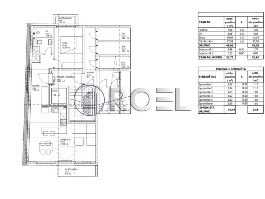Stan se nalazi u suterenu/drugi dio stana razizemlje, a sastoji od ulaznog hodnika (7,88 m2), kupaone (4,06 m2), soba (10,04 m2), dnevni boravak, kuhinja i blagovaona (27,08 m2), svjetlarnik 1 (3,48 m2), svjetlarnik 2 (1,23 m2), spremište (2- 4 m2 po izboru), te pripadajućeg parkirnog mjesta površine 12,50 m2.