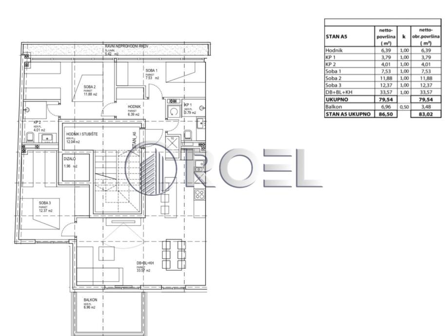 Stan se sastoji od ulaznog hodnika (6,39 m2), kupaone 1 (3,79 m2), kupaone 2 (4,01 m2), soba 1 (7,53 m2), soba 2 (11,88 m2), soba 3 (12,37 m2), dnevni boravak, kuhinja i blagovaona (33,57 m2), balkon (6,96 m2), spremište (2- 4 m2 po izboru), te pripadajućeg parkirnog mjesta površine 12,50 m2.